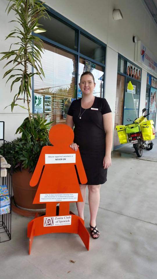 Day 12: Cr Victor Attwood’s staff support Zonta Says NO by hosting an orange lady as she stands in silence at Redbank Shopping Centre.