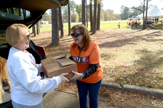 Longview resident Sharon McCord, left, drops off items to Zonta Club member Jaye Latch on Saturday during the Gifts of Giving fundraiser. (Kevin Green/Longview News-Journal)