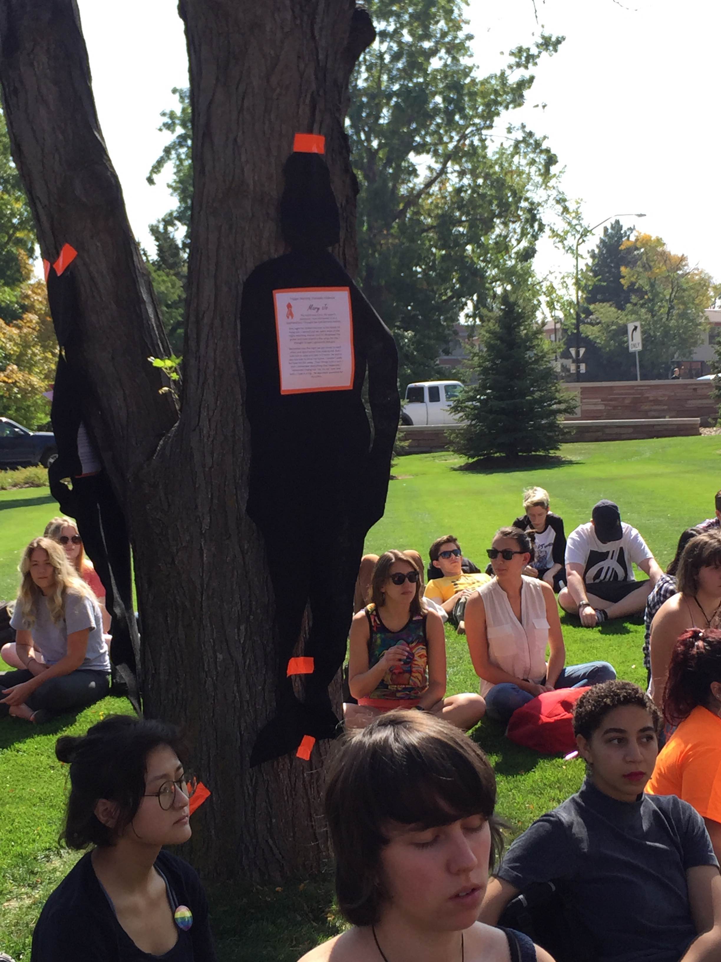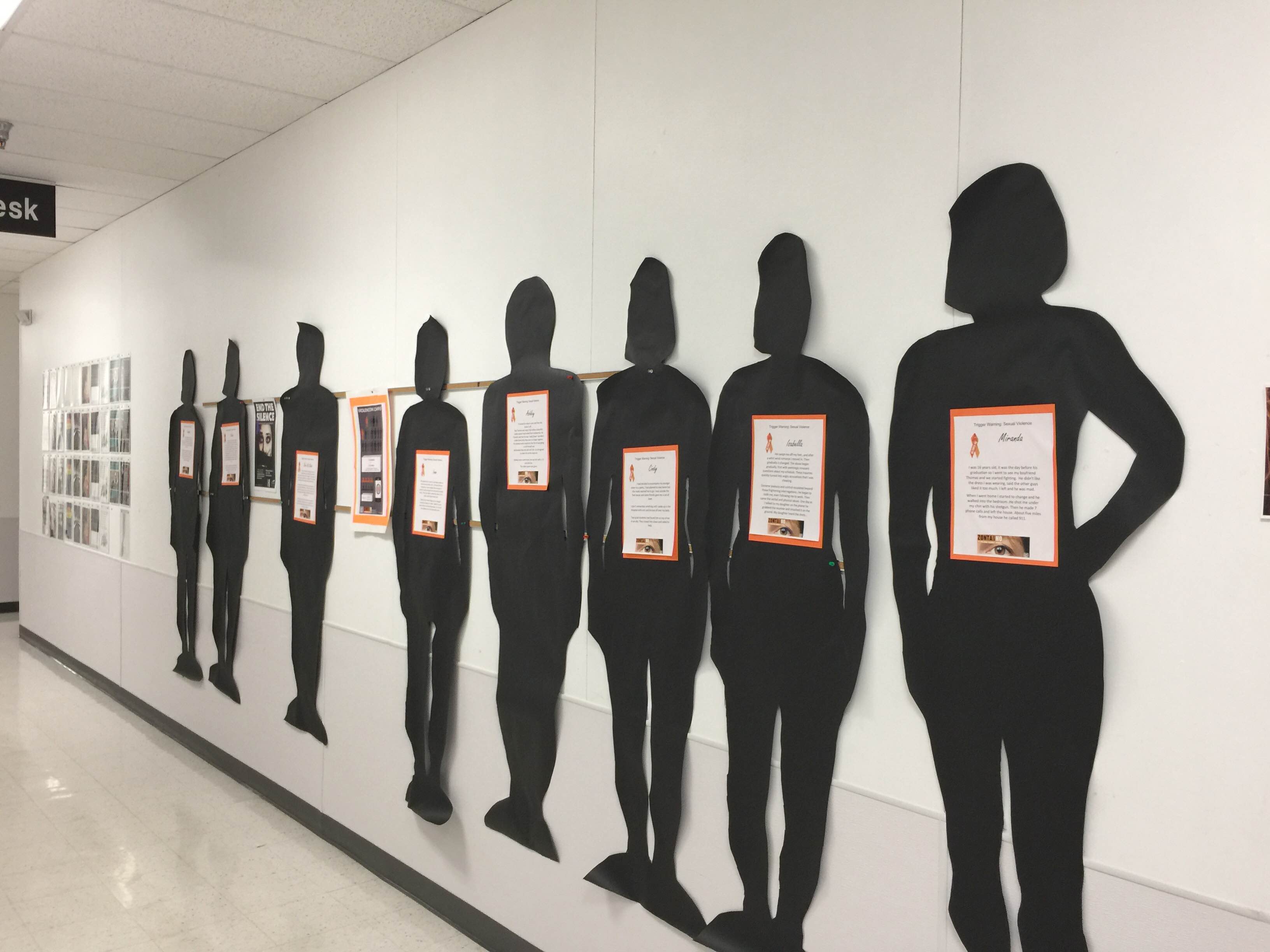 At Boulder High, Z Club members recently posted fliers on bathroom walls with the hotline number forBoulder’s Moving to End Sexual Assault, along with hanging silhouettes of victims of sexual and relationship violence on the library walls. The silhouettes include the victims’ stories.
