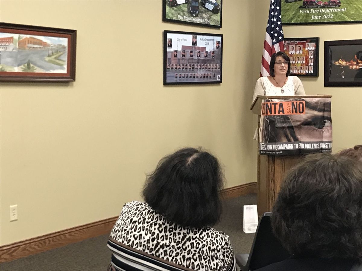 Kim Mercer speaks during the program following the Luminary Walk Against Domestic Violence. Mercer, of the Center for Youth and Family Solutions, spoke about how domestic violence affects children and families. (Photo: Ali Braboy)