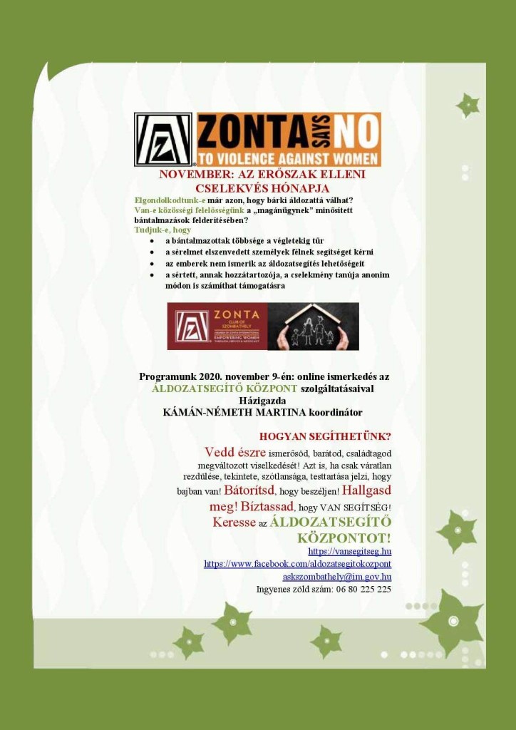 The Zonta Club of Szombathely, Hungary, has its own anti-violence program where they visit schools regularly. However, the program was suspended due to COVID-19.
