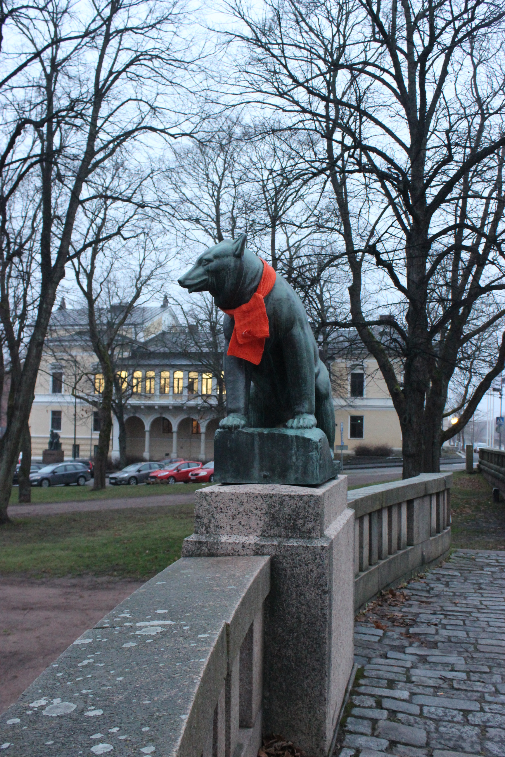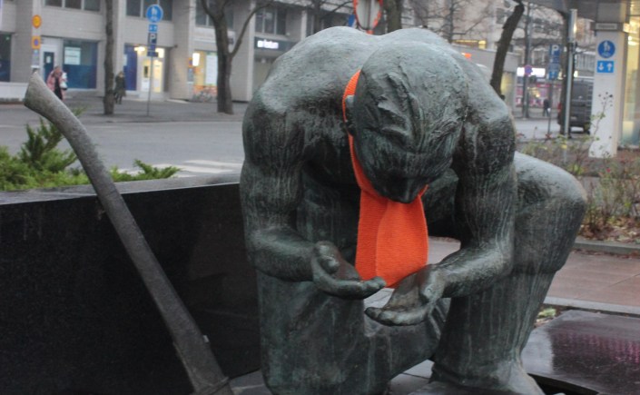 The Zonta Club of Pori I in Finland wrapped orange scarves around statues in the city of Pori.