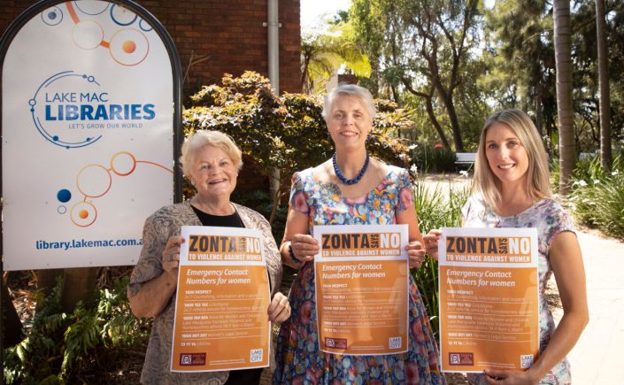 In collaboration with Lake Macquarie City Council, the Zonta Club of Hunter Newcastle, Australia, distributed domestic violence emergency phone numbers posters to all public libraries, council parks, neighborhood centers, swimming centers, surf clubs, gyms and public toilets in local shopping malls.