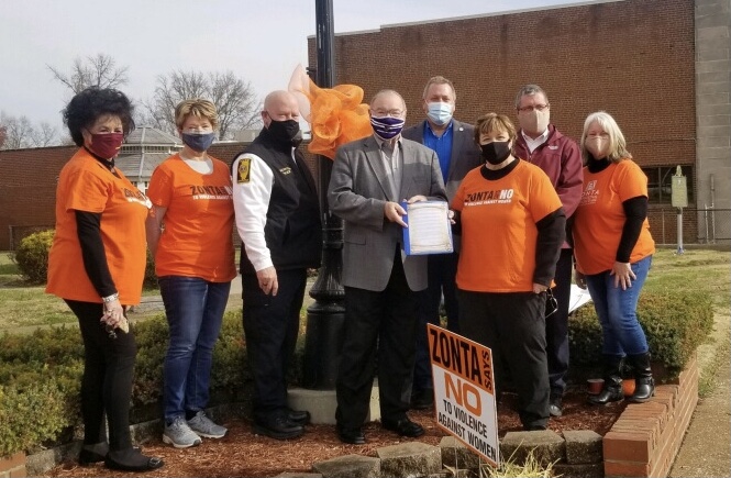 Mascoutah Mayor Jerry Daugherty signed a proclamation recognizing Zonta’s efforts to end violence against women and girls. The mayor, city manager, chief of police and chamber of commerce president all took part in the photo for the proclamation presentation.
