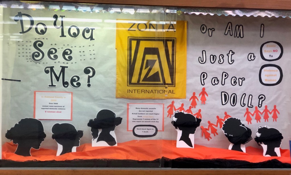 The Zonta Club of Pontiac North Oakland, USA, was permitted by their local Pontiac main library to place a Zonta Says NO display in the main case. The display went up in October for Domestic Violence Awareness Month, and it will continue to stay there for the 16 Days of Activism.