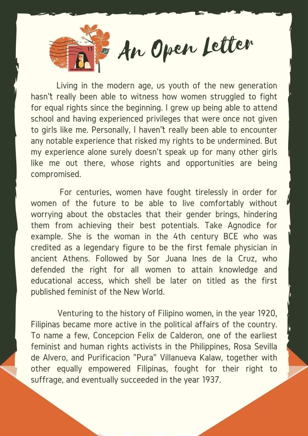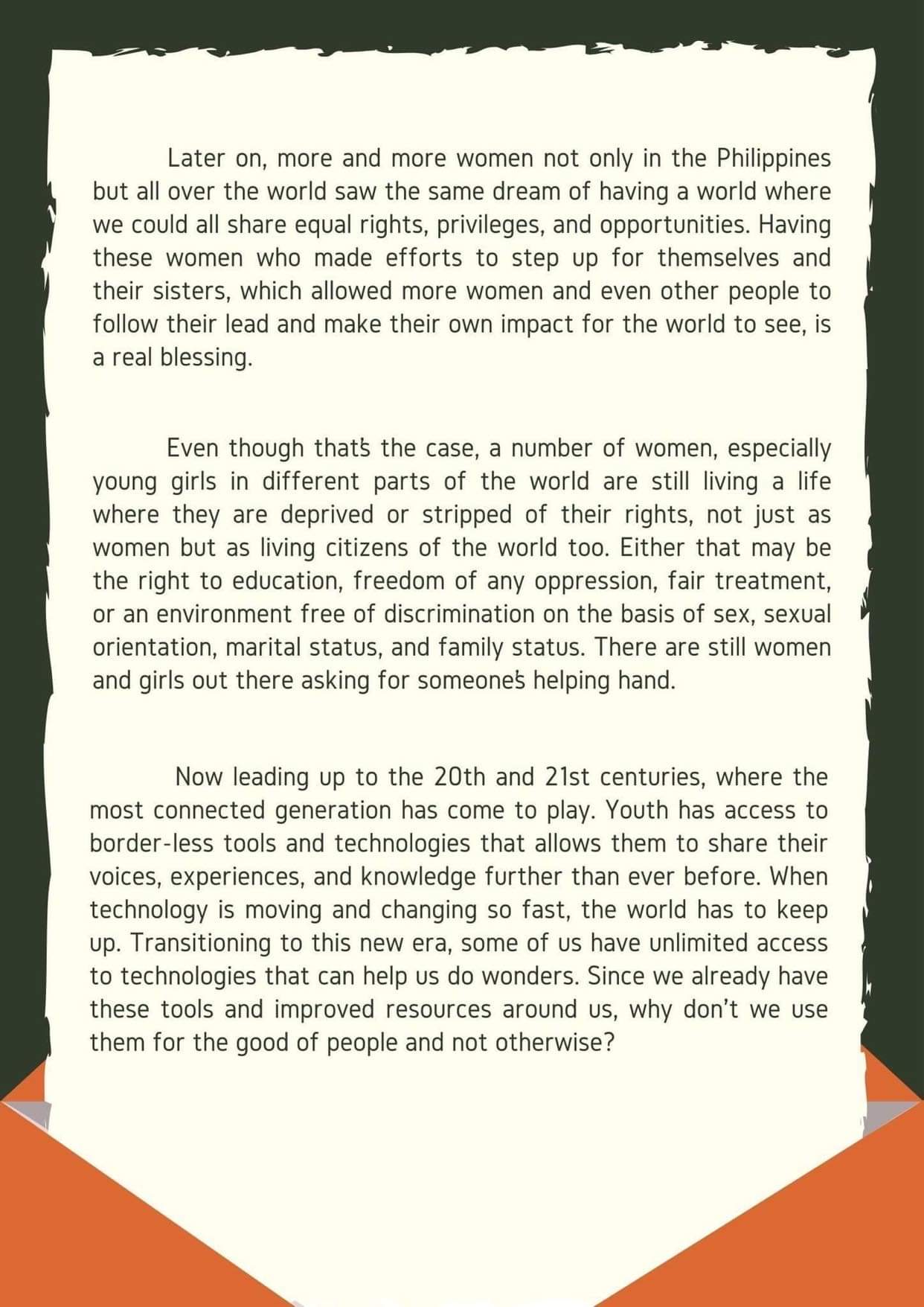 For this year’s 16 Days of Activism, the Ilocos Norte National High School Z Club, the Philippines, encouraged their classmates to imagine a world where women’s rights are recognized as human rights and that women’s capabilities are acknowledged in various fields by writing an open letter. In the open letters, the students shared their experiences to empower their peers and others worldwide to reach that goal.