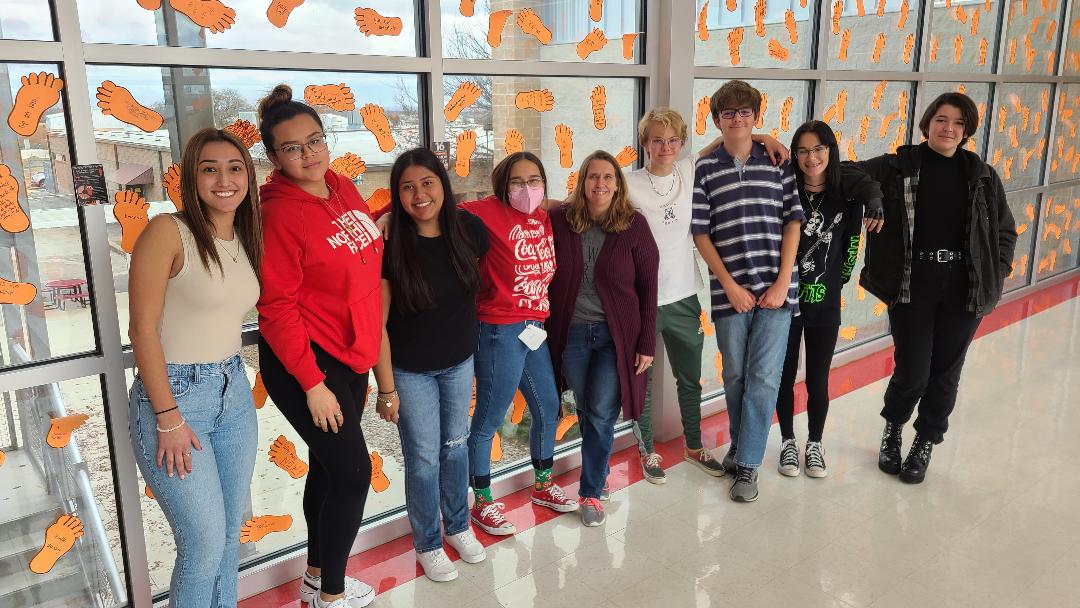 The theme A Walk in Her Footsteps was proposed for the high school campaign, and orange paper footprints lined up the main hallway for a visual impact for the students to see during the 16 Days of Activism.