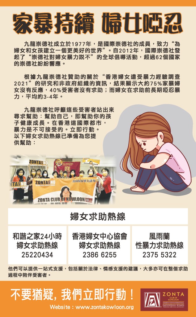 Realizing that updated statistical data on violence is severely lacking in Hong Kong and globally, the Zonta Club of Kowloon sponsored the ‘Hong Kong Women’s Experience of Violence 2021’ research. Scientific research on domestic and sexual violence is needed now more than ever.