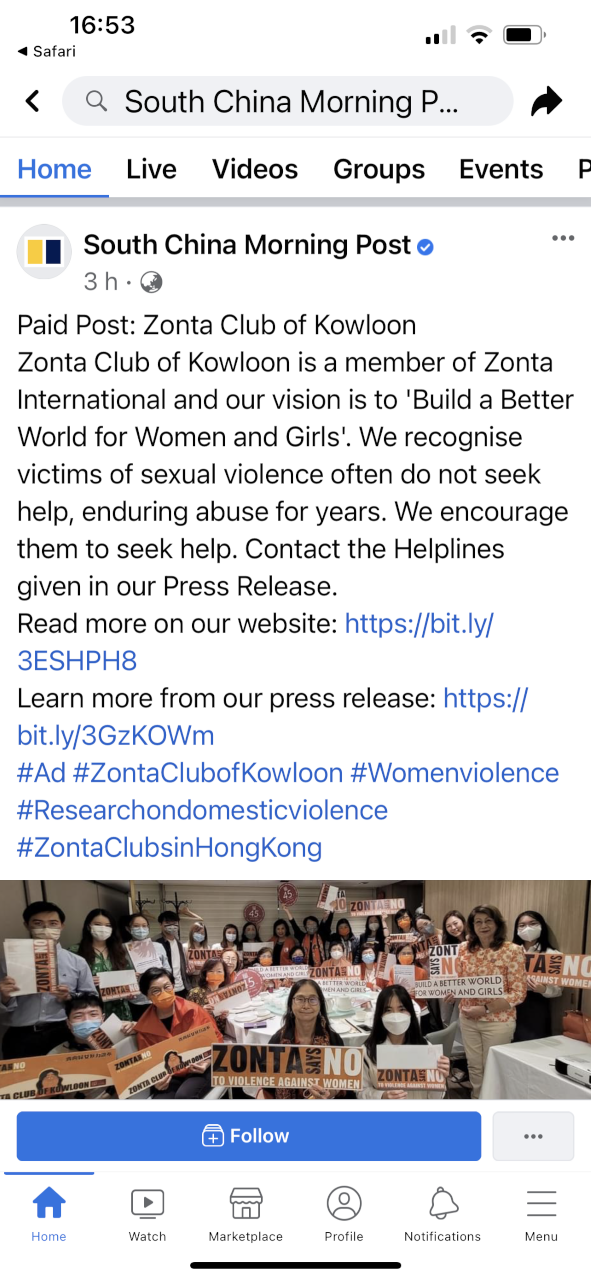 To encourage victims to come forward, the club arranged three advertorials on 25 November, the International Day for the Elimination of Violence Against Women. The posters will include statistics from their finding and information on three women’s helplines that will provide one-stop support, including advice on legal protection and emotional support and accompany the victim throughout the entire help-seeking process. The club released the ads on three big local media: South China Morning Post’s Facebook news, Ming Pao Daily and Sing Tao Daily.