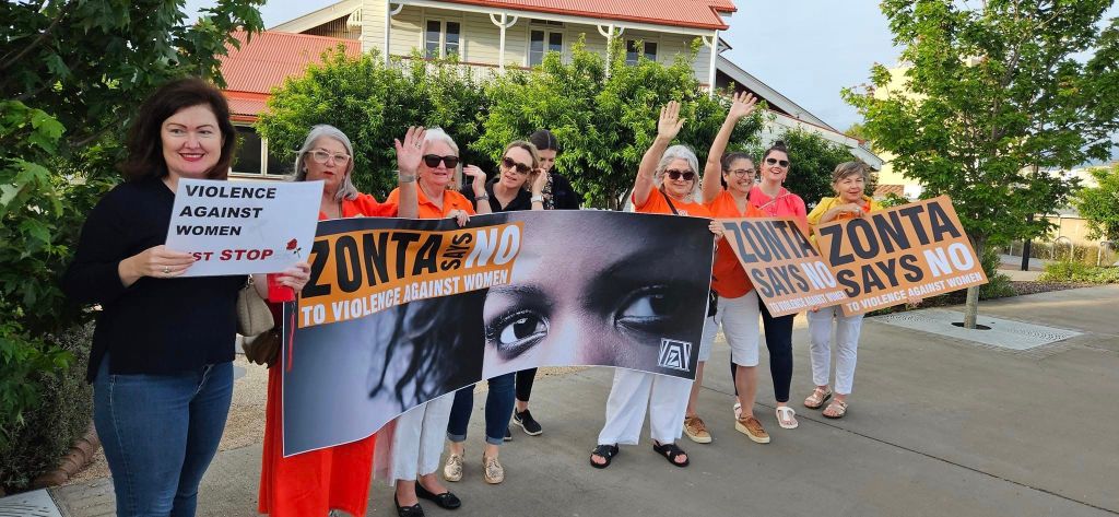 The Zonta clubs of Toowoomba Garden City Inc and Toowoomba Inc, Australia, partnered with a Zonta e-club, the Domestic Violence Action Centre (DVAC), Toowoomba Together Inc and Protea Place to stand together to eliminate violence against women and children. Dressed in orange and holding up banners, they lined the Victoria Street Bridge from 4 to 5:30 PM, the busiest time, to bring awareness to the issue.