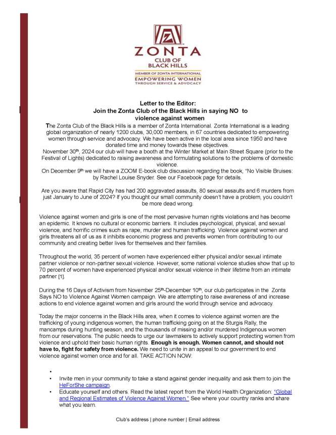 A letter to the editor of the Rapid City Journal was sent, urging the community to join the Zonta Says NO campaign and take collective action to combat violence.