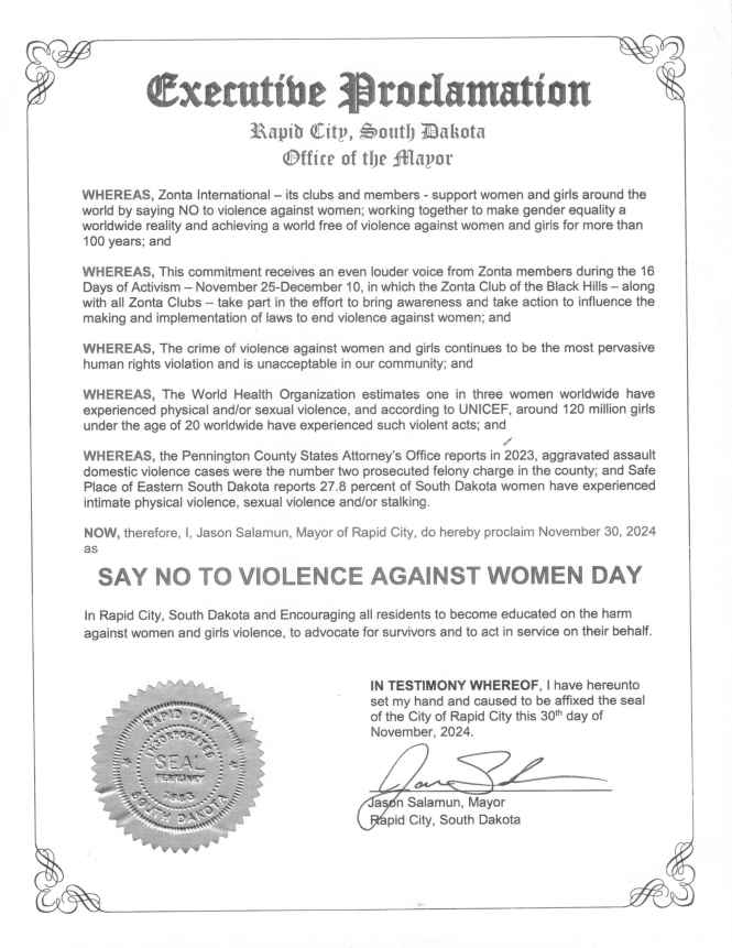 The Zonta Club of Black Hills, USA, took a stand against domestic violence during the Zonta Says NO to Violence Against Women campaign, supported by a proclamation from Rapid City Mayor Jason Salamun. The proclamation underscored the importance of Zonta’s global advocacy efforts to eliminate violence against women and girls.