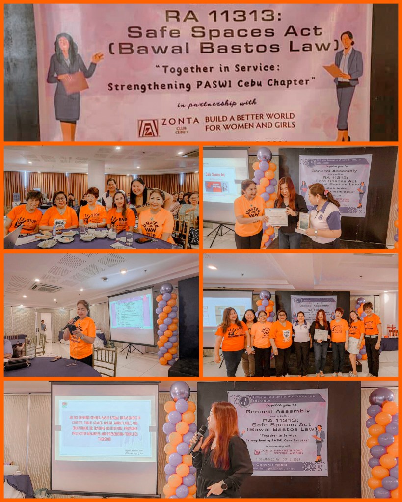 On Day 12 of the campaign, Attorney Noemi Truya Abarientos delivered a compelling talk on the Safe Spaces Act, also known as the Bawal Bastos Law, at One Central Hotel in Cebu City. The event was organized by the Philippine Association for Social Workers Inc. Cebu Chapter in collaboration with the Zonta Club of Cebu I, Philippines, focusing on creating safe and respectful spaces for all.