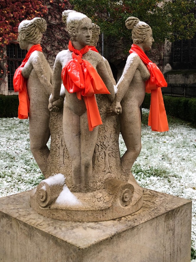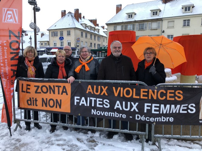 On 22 November, the Zonta Club of Châtillon-sur-Seine et Région, France, adorned key landmarks in the town orange. A banner and orange fabric were also wrapped around the central fountain, and Zonta signs were placed at the city’s entrances. The statues in the garden of the tourist office and the Marianne statue in the Mayor’s office were both fitted with orange scarves. One of the city gates was also illuminated in orange, while a visual message was displayed prominently on the town’s light panel throughout the campaign.