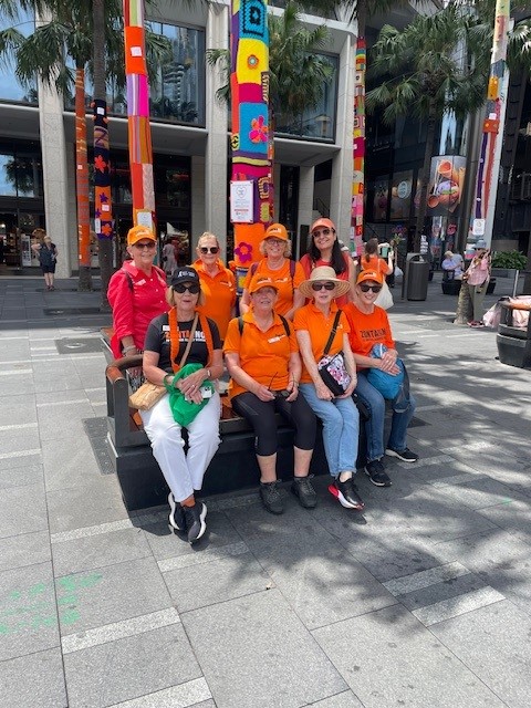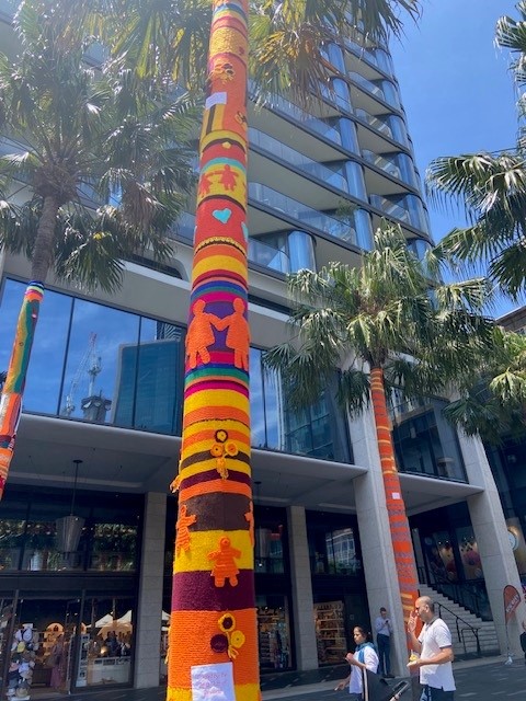 Zonta District 24, secured a prominent location in Sydney for the yarnbombing initiative during the 16 Days of Activism. The site featured a grove of 15 palm trees overlooking Sydney Harbour, with stunning views of the Sydney Harbour Bridge, the international cruise ship wharf, and the promenade leading to the Sydney Opera House.