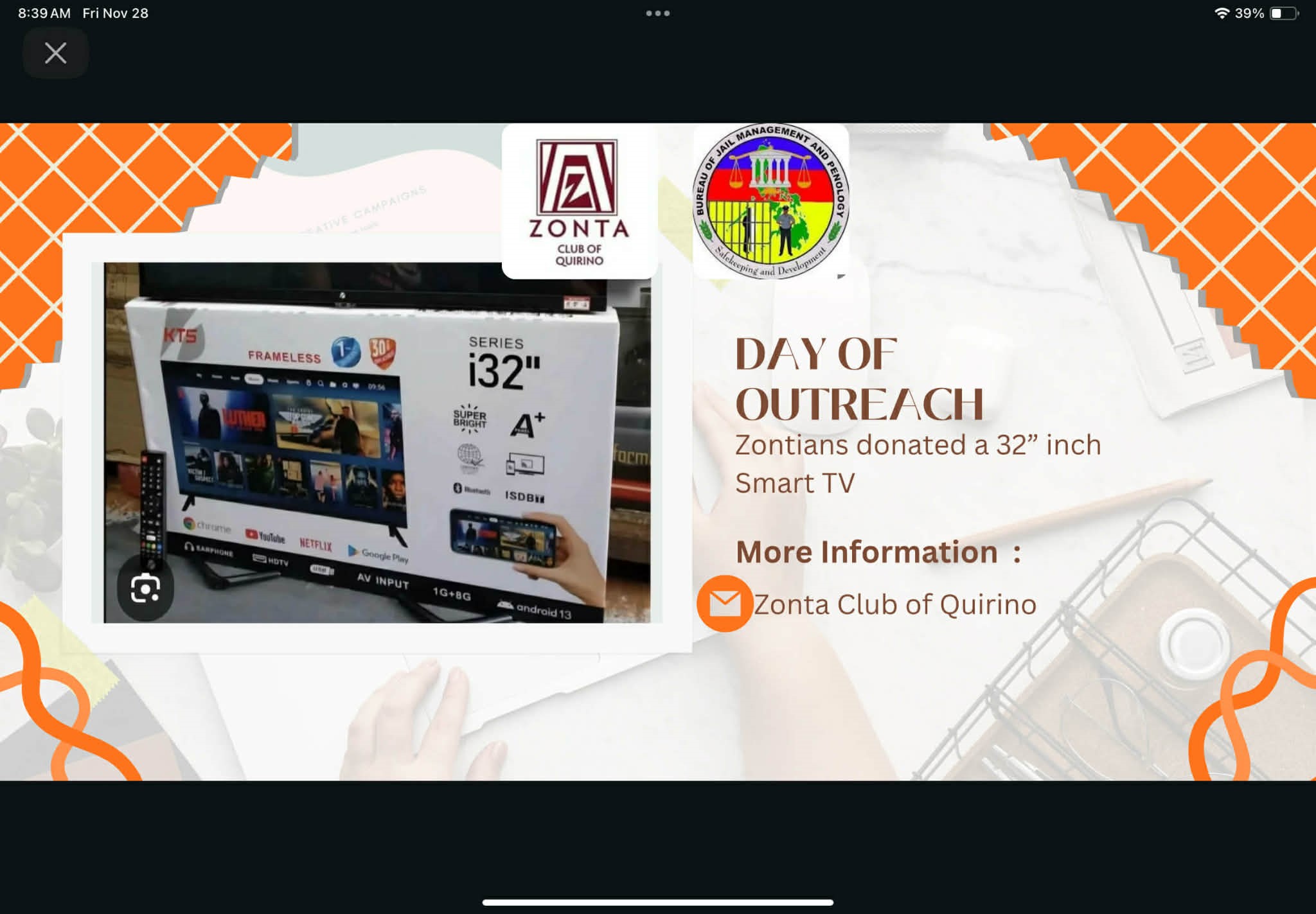 In line with the club’s commitment to providing a comfortable stay for female Persons Deprived of Liberty (PDLs) while they are in prison, a 32-inch smart television was delivered to the BJMP Quirino by Zontian Aleah Aniciete-Abaya and Zontian Glenda Garay Mina.