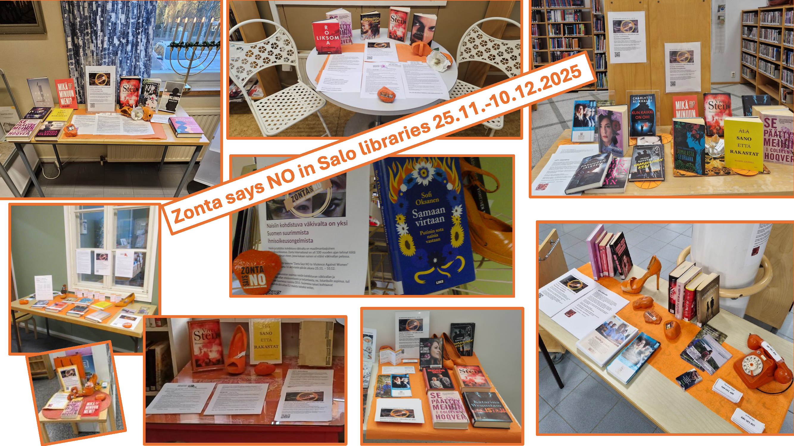 The Zonta Club of Salo, Finland, has organized the “Zonta Says NO” events again this year, in collaboration with the Salo libraries. From 25 November 25 to 10 December, during the Orange Days, all libraries in the Salo area will have a designated table or shelf featuring literature on violence against women and girls, as well as information on prevention measures. Additionally, these locations will provide contact information and resources for individuals who have experienced violence.