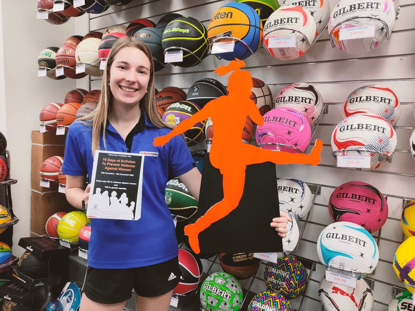 For the 16 Days of Activism against Gender-Based Violence, members of the Zonta Club of Adelaide Hills Inc, Australia, canvassed local businesses. As a result, 18 businesses and two state politicians’ offices displayed a total of 37 orange ladies with accompanying flyers and countertop information sheets on the 16 Days of Activism.