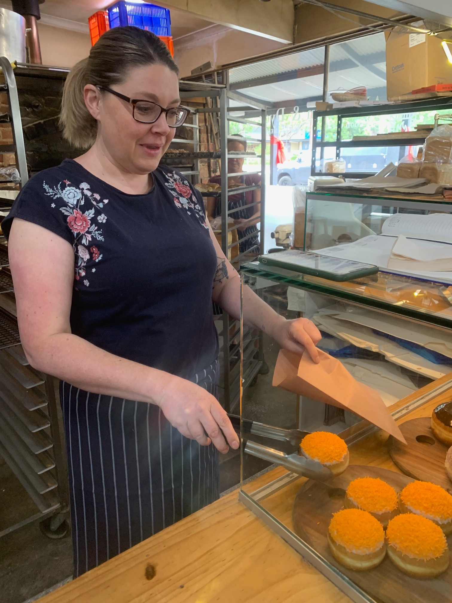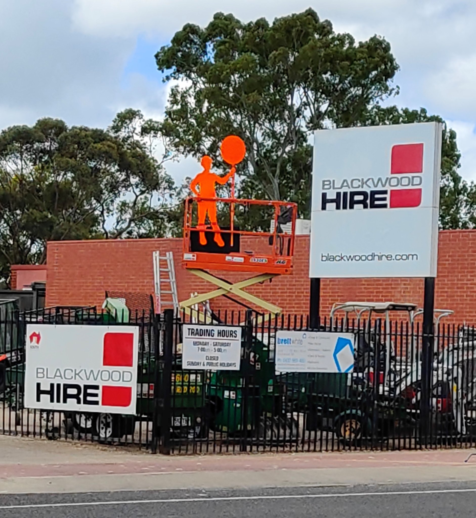 A boutique effectively dressed their window in all orange items for the 16 days and a bakery made orange iced donuts and displayed the countertop information appropriately. In addition, two orange ladies were displayed in the local Federal Member of Parliament’s office in Canberra. One particular orange lady that drew attention was displayed atop a crane at an Equipment Hire facility. All the orange ladies were modeled on actual people and used with their permission.