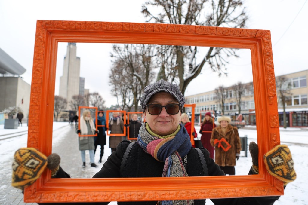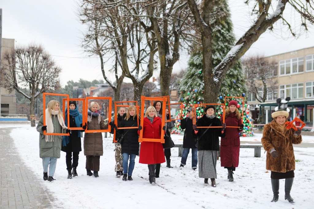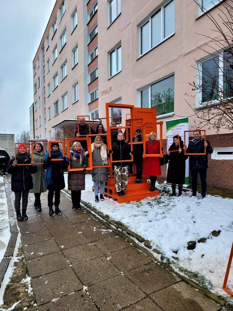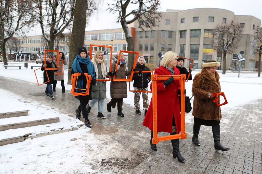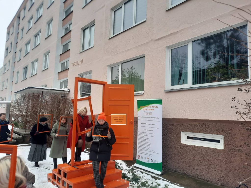 After the lectures, people met outside the Alytus City Theatre and formed a procession to the Alytus Women’s Crisis Center, where there was an orange door symbolizing opening a door if you need help.