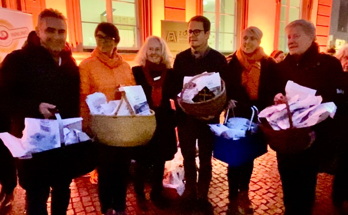 As in Offenburg, the Christmas lighting and the Christmas Market started 26 November and the Zonta club had to organize the campaign before that date. At the same time, a cooperation with the bakers’ association was initiated and 40,000 bread bags were printed that were distributed to all the local bakery shops. They had the slogan “Zonta Says NO” printed on one side and “Gewalt kommt mir nicht in die Tüte” on the other side. “Das kommt nicht in die Tüte” is a German saying meaning “this is an absolute no-go”, so the inscription reads “Violence is an absolute no-go”.